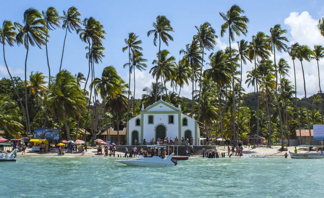 A charmosa Praia dos Carneiros, no litoral sul de Pernambuco, conquista pela paisagem digna de cartão-postal: coqueiros à beira-mar, areia branca, piscinas naturais e uma famosa igrejinha à beira da praia (Igreja de São Benedito).